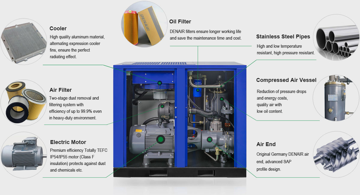 Adopta componentes de renombre mundial, como electrónica Schneider de Francia, sensor de presión Danfoss de Dinamarca, etc., que contribuyen a garantizar una vida útil más larga del compresor.