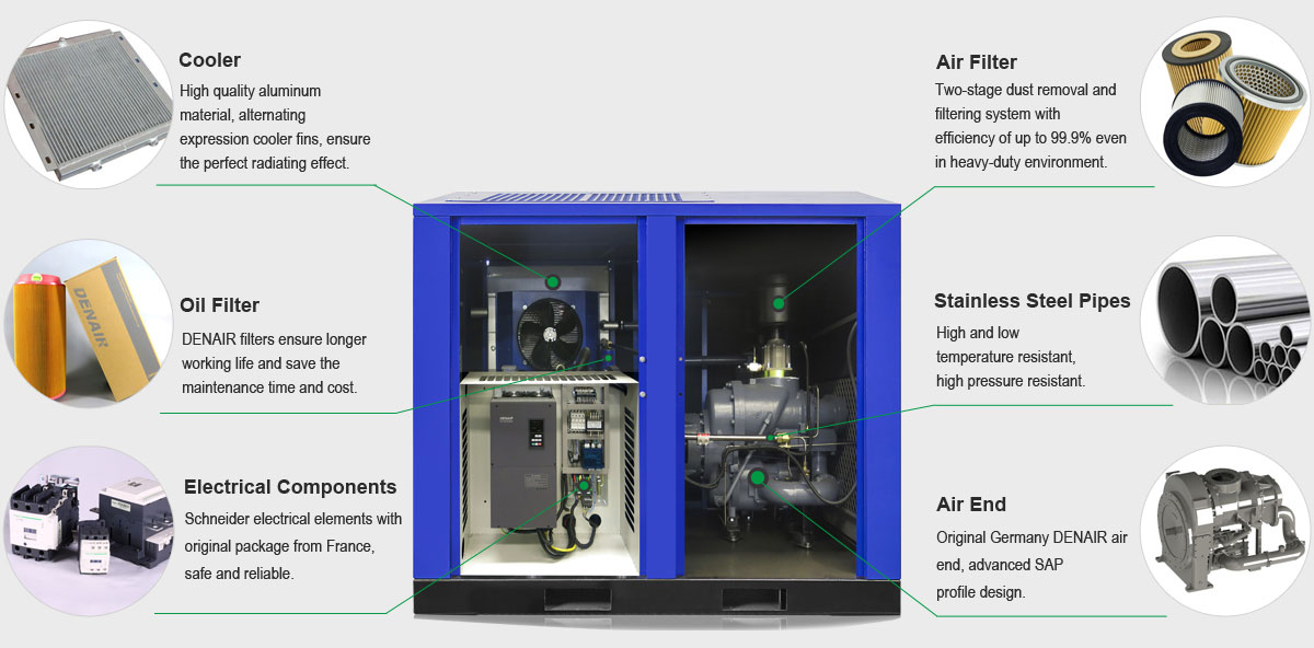 Adopta componentes de renombre mundial, como electrónica Schneider de Francia, sensor de presión Danfoss de Dinamarca, etc., que contribuyen a garantizar una vida útil más larga del compresor.