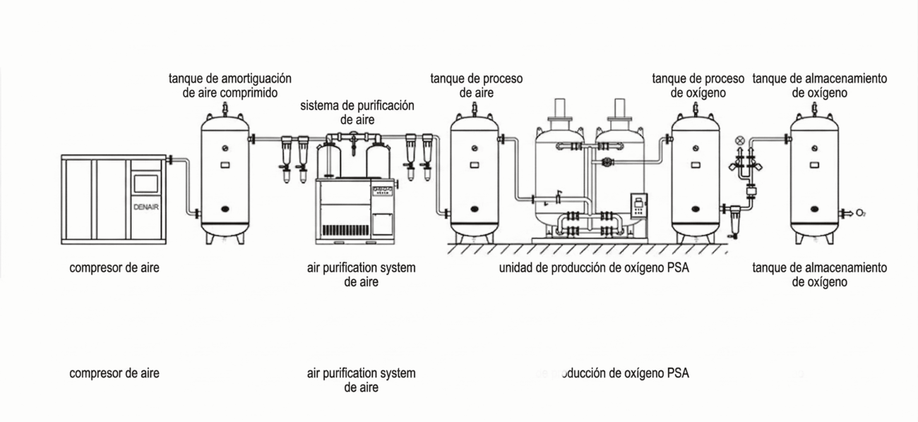 El equipo de producción de oxígeno por adsorción por oscilación de presión (PSA) consta de varios componentes principales: un compresor de aire, un tanque de compensación de aire comprimido, un sistema de purificación de aire, un tanque de proceso de aire, una unidad de producción de oxígeno, un tanque de proceso de oxígeno, un sistema de control eléctrico y un tanque de almacenamiento de oxígeno.