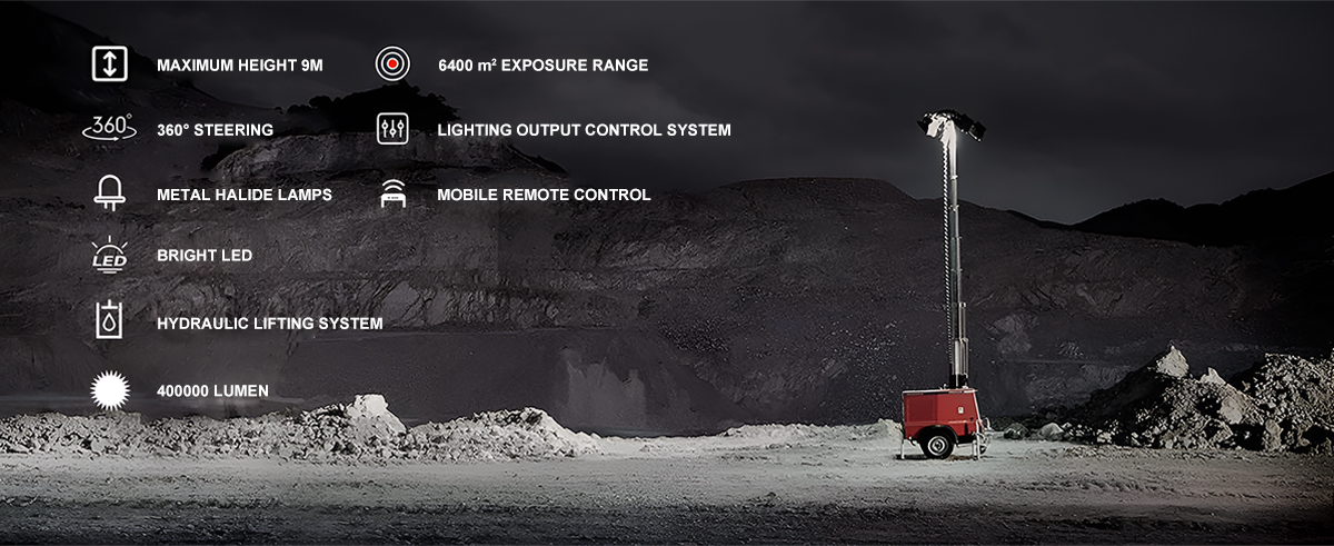 • Amplia cobertura de iluminación: La estructura de lámparas en paralelo de la torre de iluminación móvil es más eficiente que los sistemas convencionales, entregando hasta un 50% más de salida de luz. El reflector superior, de diseño único, captura un 10% adicional de luz ascendente que de otro modo se perdería y la redirige directamente al lugar de trabajo.